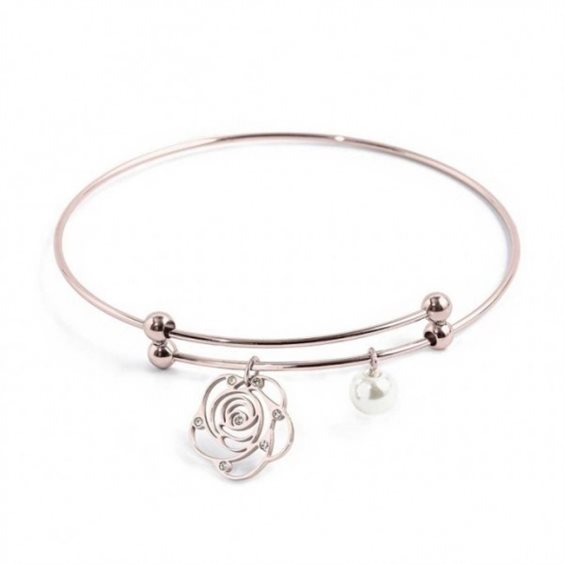 Bracciale rigido in acciaio pvd rosè con perla bianca tonda pendente e pendente a forma di rosa forata con cristalli, Marlù logo sul lato