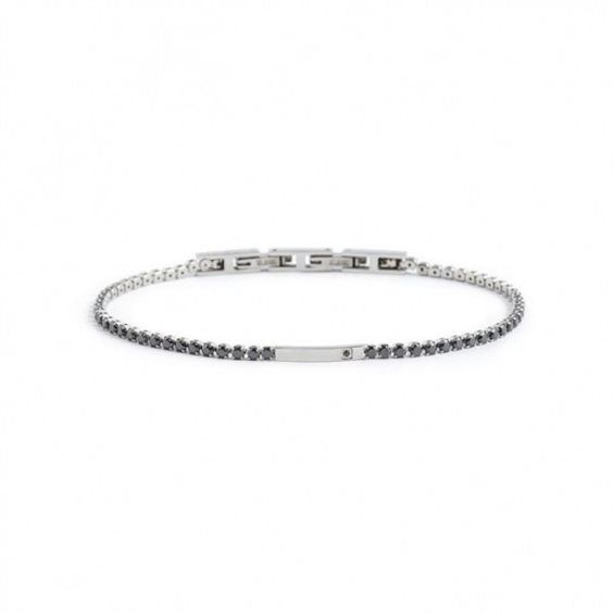 Bracciale in acciaio con catena tennis con cristalli neri con diametro 2 mm. Al centro una placca in acciaio con un cristallo nero sul lato. Lunghezza totale 19,8 cm, regolabile da 19,8 a 18,4 cm tramite chiusura a scatto removibile. Materiali: acciaio, cristalli