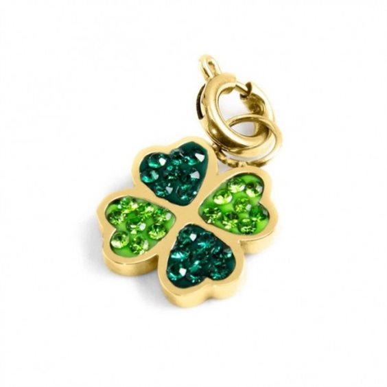 Charm in acciaio con pvd oro a forma di quadrifoglio. Sul fronte il charm ha cristalli verde scuri e verde chiari, sul retro è presente il logo MARLU'