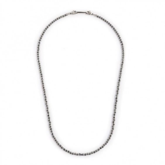 COLLANA CON EMATITE SFACCETTATA E LISCIA ACCIAIO - Collana in acciaio con catena box, con elementi di ematite sfaccettata e liscia alternata ad elementi in acciaio. Lunghezza totale 52 cm, regolabile da 52 a 50 cm tramite logo tag Marlù in acciaio removibile
