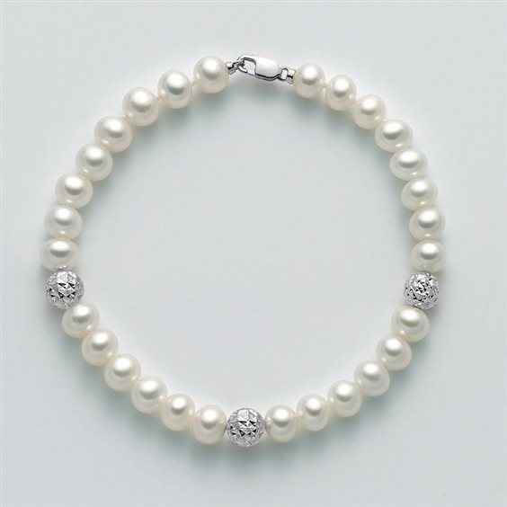 Oro 750/1000 Perle Naturali Coltivate Colore Bianco 6-6,5 mm. Boule sfaccettata con diamantatura Microfusione-Lunghezza 19.5 cm.