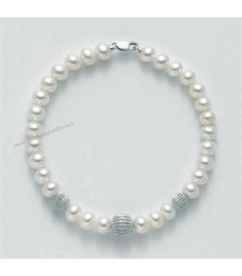 Bracciale filo di perle d'acqua dolce 5 - 5,5 colore bianco ideato e realizzato da Miluna, il bracciale è impreziosito da tre boule puntinate rigate in oro bianco 18 carati, lunghezza bracciale 18 centimetri, chiusura a moschettone.