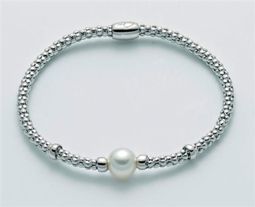 Bracciale donna , argento rodiato 925% , diametro cm 6 , anima in silicone , distanziali in argento liscio , perla bianca coltivata in acqua dolce , mm8.5-9 Immagine indicativa , la confezione può variare di forma e colore , scatola garanzia originali.