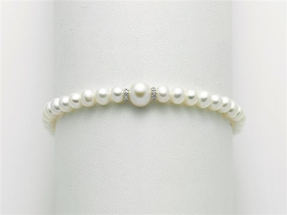 PERLA Taglio: Rotondo Colore: BIANCO Dimensioni: Diametro 5-5,5 PERLA CENTRALE Numero gemme: 1 Taglio: Rotondo Colore: BIANCO Dimensioni: Diametro 7,5-8 DIAMANTE Numero gemme: 6 Taglio: BRILLANTE Carati: Pt. tot 2.4 Colore: G Selezionato Note: Microfusione Griffes ORO 750/1000 Numero Distanziatori : 2 Note : Moschettone in oro bianco 750/1000
