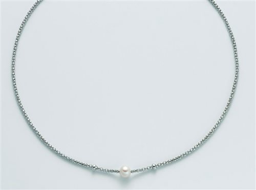 Collana donna , argento rodiato 925% , girocollo lunghezza cm 45 regolabile fino a cm 43 , distanziali in argento liscio , perla bianca coltivata in acqua dolce , mm 7.5-8 Immagine indicativa , la confezione può variare di forma e colore , scatola garanzia originali.