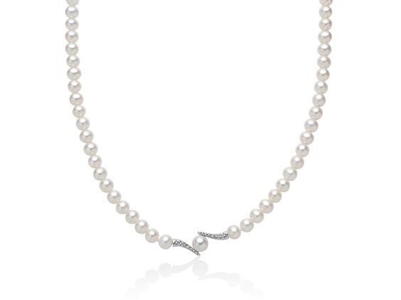 Collana in oro bianco 18 carati con perle d'acqua dolce 5 - 5,5 colore bianco è stata ideata e realizzata da Miluna. La collana Miluna è impreziosita da due diamanti di carati totali 0,01 colore G purezza SI taglio brillante rotondo e una perla d'acqua dolce (centrale) 6,5 - 7 colore bianco, lunghezza 40 centimetri, chiusura a moschettone.