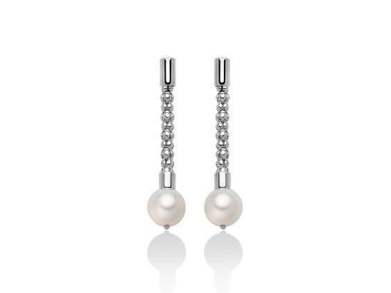 Orecchini donna , argento 925% rodiato , maglia modellofope , pendente lunghezza cm 3.5 , perle bianche coltivate in acqua dolce , mm 8-8.5. Immagine indicativa , la confezione può variare di forma e colore , scatola garanzia originali.