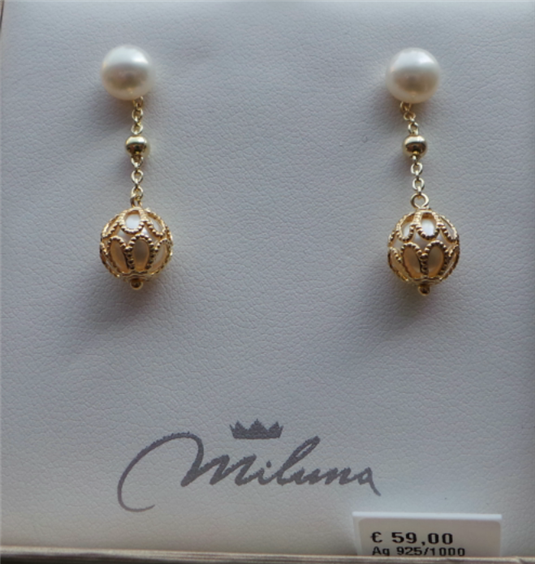 Orecchini pendente in argento placacto oro giallo , con perle, chiusura con farfallina.