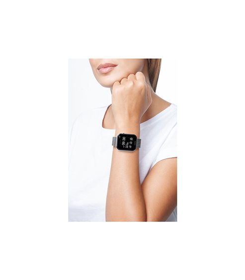 Smartwatch con cassa in Alluminio e ABS e bracciale maglia Milano in acciaio. Dimensioni cassa 44x37x13 mm. Display 1.83” Color full touch. Circonferenza interna del cinturino: da 180 mm a 140 mm. Chiusura a scorrimento in acciaio. Caratteristiche tecniche: Distanza di comunicazione: circa 10 metri CPU: realtek8762dk Waterproof: IP67 Versione Bluetooth: BT 5.1 Batteria: 230 mAh Li-polymer Sistemi compatibili: Android 5.0 o versioni superiori, IOS 9.0 o versioni superiori Funzioni: Chiamata e notifica. Pedometro, Wrist sense, Calorie, Distanza, Cronometro, Freq. Cardiaca, Pressione sanguigna, Ossigenazione, Timer, Sleep monitor, Sveglia, Sedentary reminder, Sport, Avviso bere, Music remote contol, Meteo, Scatto, Ricerca smartphone, Sfondo personalizzabile.
